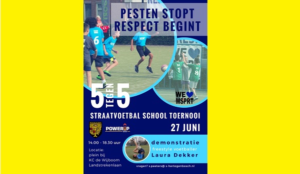 Samen met de wijkmanager van de Maaspoort en PowerUp073 organiseert RKVV Wilhelmina op woensdag 27 juni een 5 tegen 5 straatvoetbal school toernooi in het kader van ‘Pesten stopt Respect begint’. Het toernooi, dat plaatsvindt op het plein bij KC de Wijboom aan de Landstrekenlaan, is voor groep 6 en 7 van de basisscholen in de Maaspoort.
