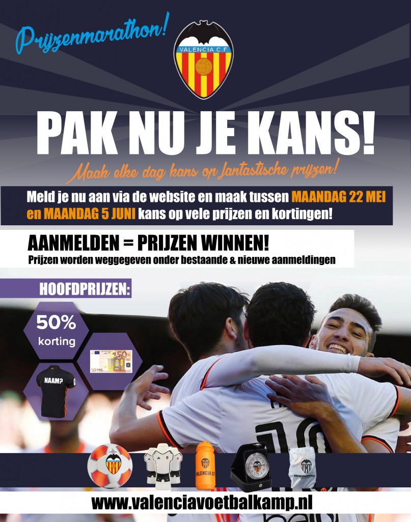 Het Valencia Voetbalkamp is van 17 t/m 19 juli bij RKVV Wilhelmina. Meld je nu aan op www.valenciavoetbalkamp.nl en maak kans op prijzen en kortingen. De prijzen worden ook weggegeven onder bestaande aanmeldingen